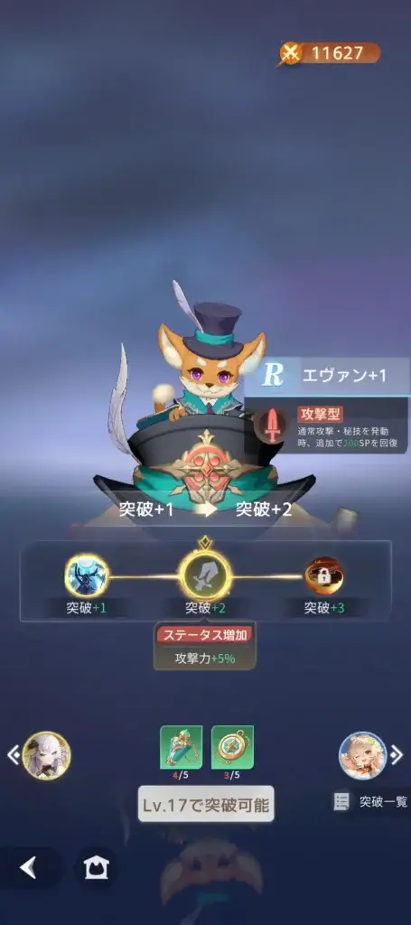 突破をすることでキャラ(冒険者)のスキルの強化を行え、戦闘力を伸ばすことができます。突破に冒険の水筒が必要です。