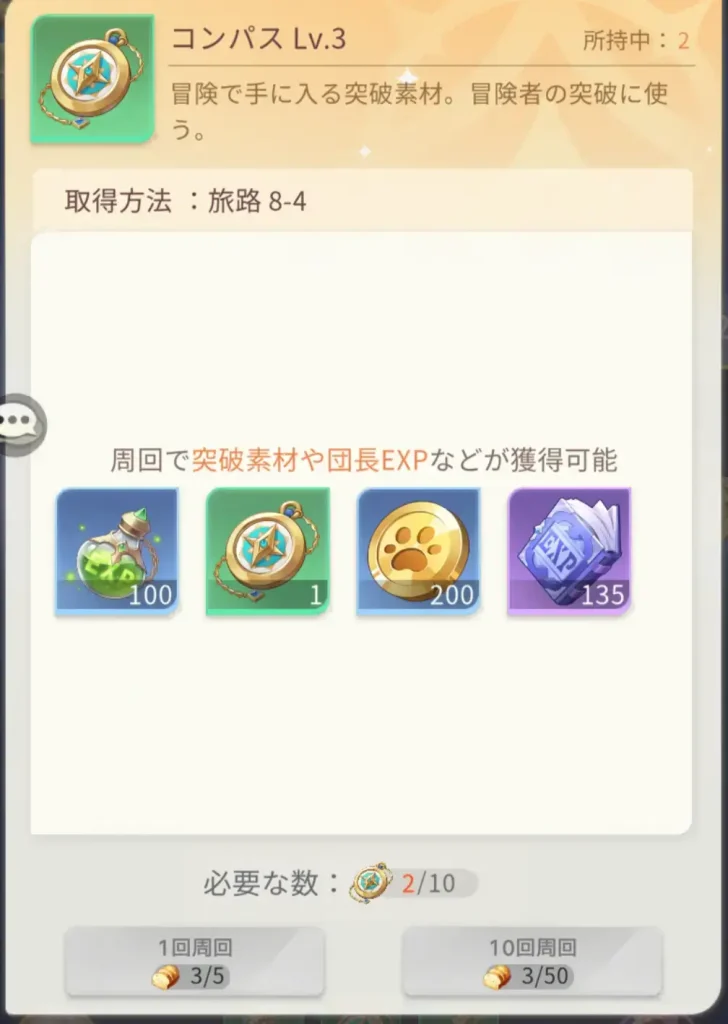 旅路を進めることで突破素材を入手できることがあります。旅路はメインなので進めるようにしましょう。
