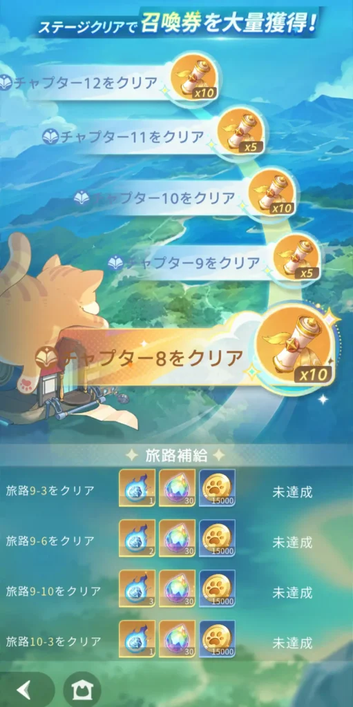 旅路のステージをクリアすることで通常召喚の書を入手できます。1定「ステージまで進めば、5個~10個程度入手できます。