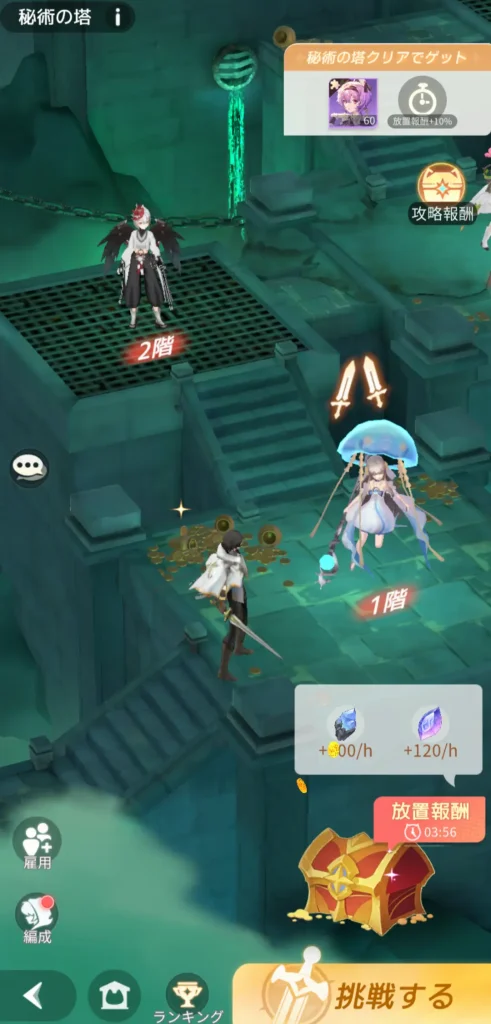 放置報酬は、勇者の塔の最初、『溶岩の塔』を全60階でクリアすると、放置報酬の機能が開放されます。
