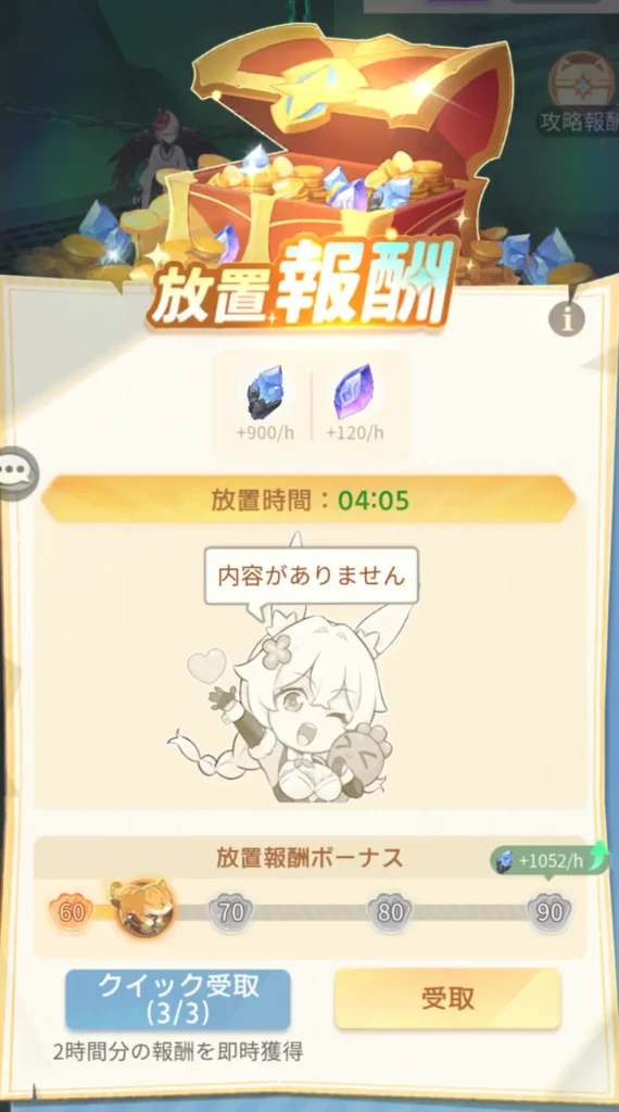 放置報酬は最大24時間で報酬がもらえます。毎日ログインした問いに1階は受け取る必要があります。