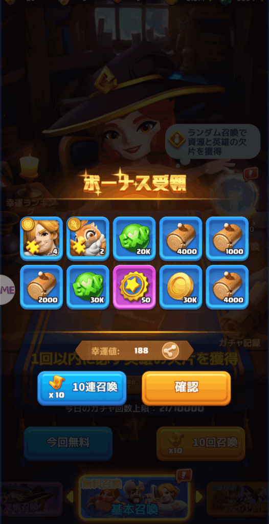 基本召喚で英雄経験値を入手できます。英雄経験値の入手量は10k~50k入手できます。