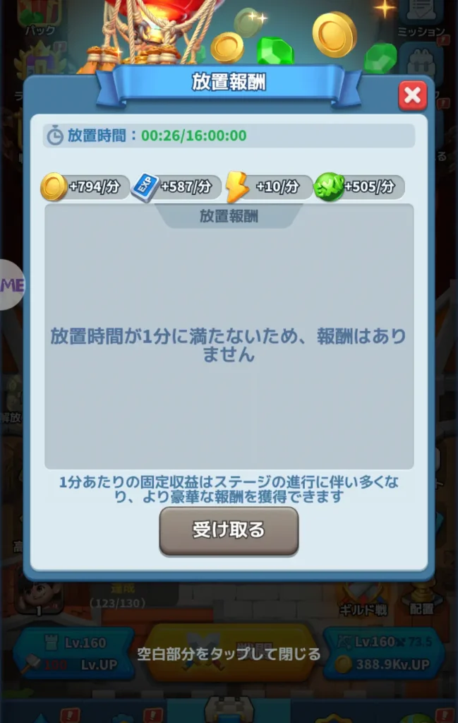 放置コンテンツでプレイヤー経験値を入手できます。放置報酬や高速放置でプレイヤー経験値を入手できます。