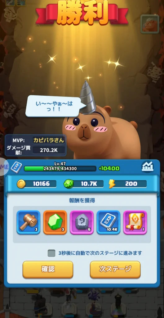メインステージを進めることでプレイヤー経験値を入手できます。メインステージはコンテンツの解放に必要なので進めていく必要があります。