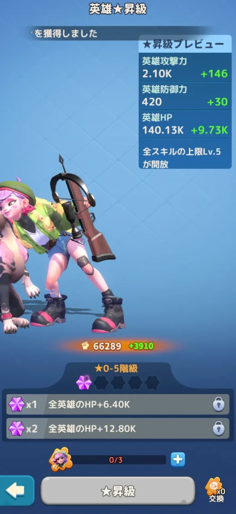 英雄の星昇級を行うことで。HPや攻撃力などの基本ステータスが大きく上がります。星昇級には同じ英雄の欠片を集める必要があります。