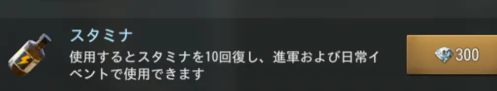 ジェムを300個使用することでスタミナを10回復することができます。ジェムで回復する前にスタミナのアイテムがあればそっちを使用するようにしましょう。