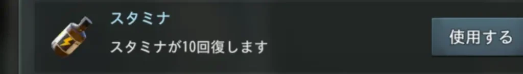 スタミナはアイテムで回復します。スタミナアイテムは1つでスタミナを10回復することができます。