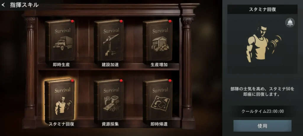 指揮スキルを使用することで、スタミナを即時回復することができます。スタミナを1日1回50回復させることができます。クールダウンは23時間です。