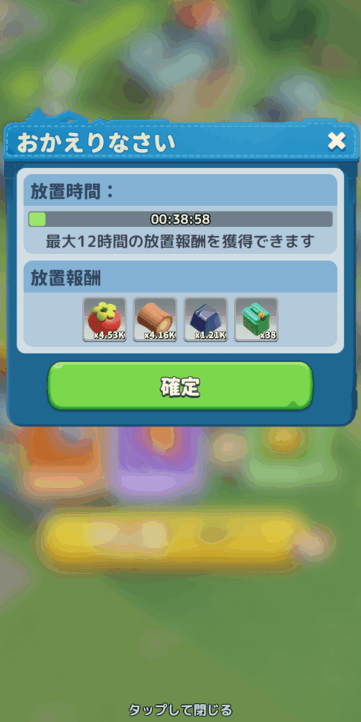 放置報酬で木材を入手できます。放置報酬は最大で12時間ためることができます。オフラインでもたまっていきます。1日2回受け取っておくことで多くの木材を入手できます。