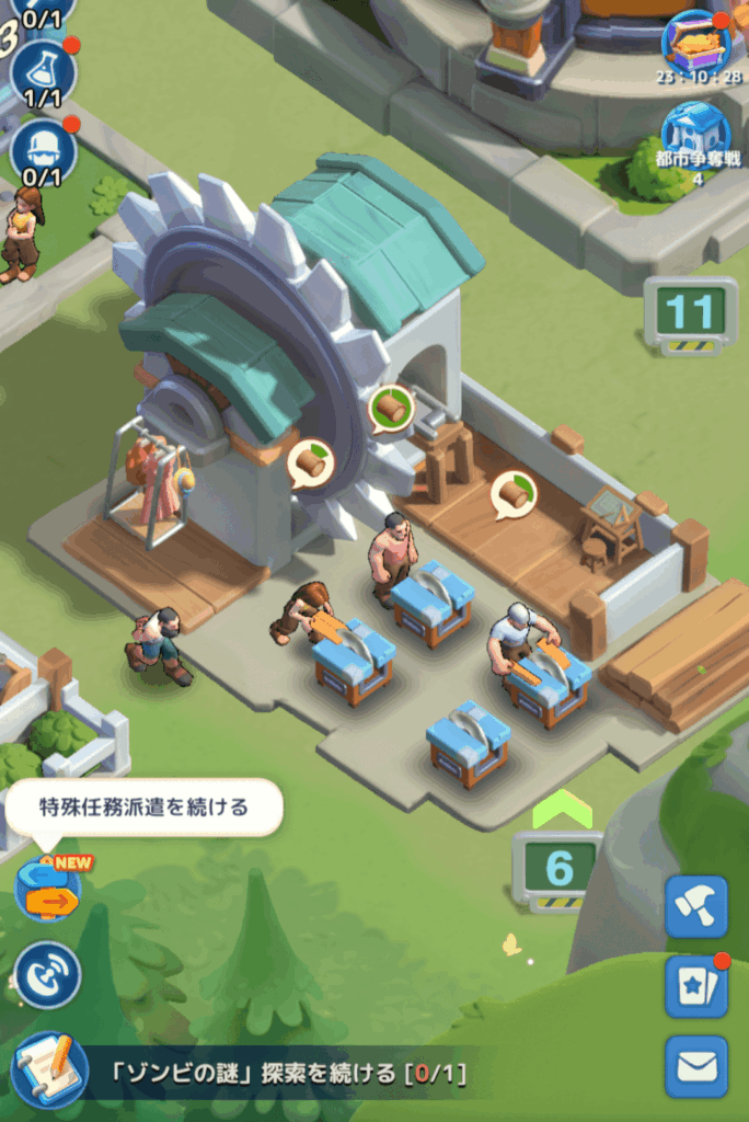木材所で木材を入手できます。木材所のレベルを上げることで時間当たりの木材の量が増えます。また、住民を配置することでさらに入手できる量が増えます。