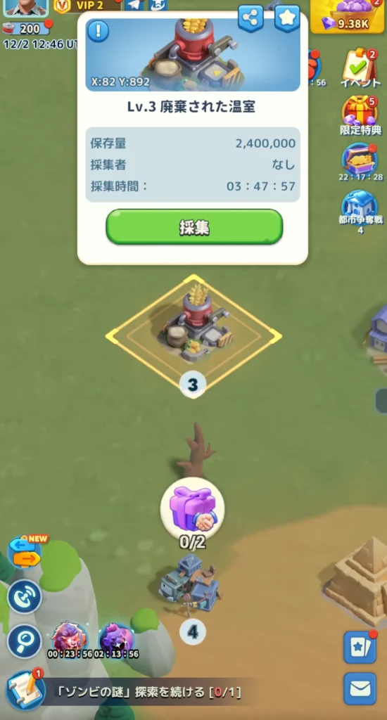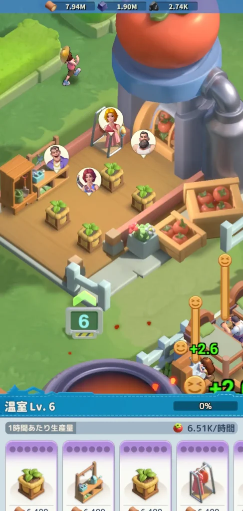 温室で食料を入手できます。温室はレベルがあがるほど食料の入手量が増えます。