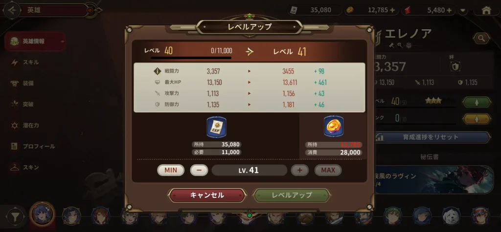 英雄EXPとゴールドを使うことで英雄のレベルを上げることができます。英雄EXPやゴールドはダンジョンや冒険ステージなどで入手できます。