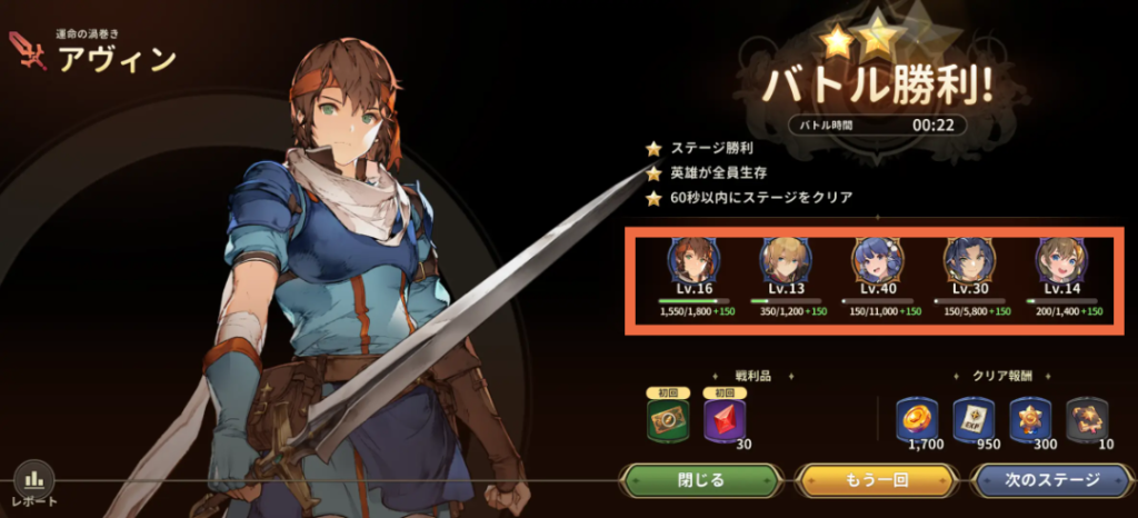 冒険ステージをクリアすることで英雄のレベルを上げることができます。ただし1ステージ150経験値しか入手できないので、効率は悪いです。スタミナが余っていると周回すると装備なども入手できるので良いでしょう。