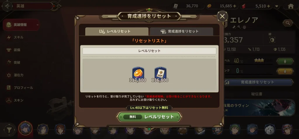 英雄のレベルはリセットをすることができます。リセットをすることで英雄EXPやゴールドが返還されます。