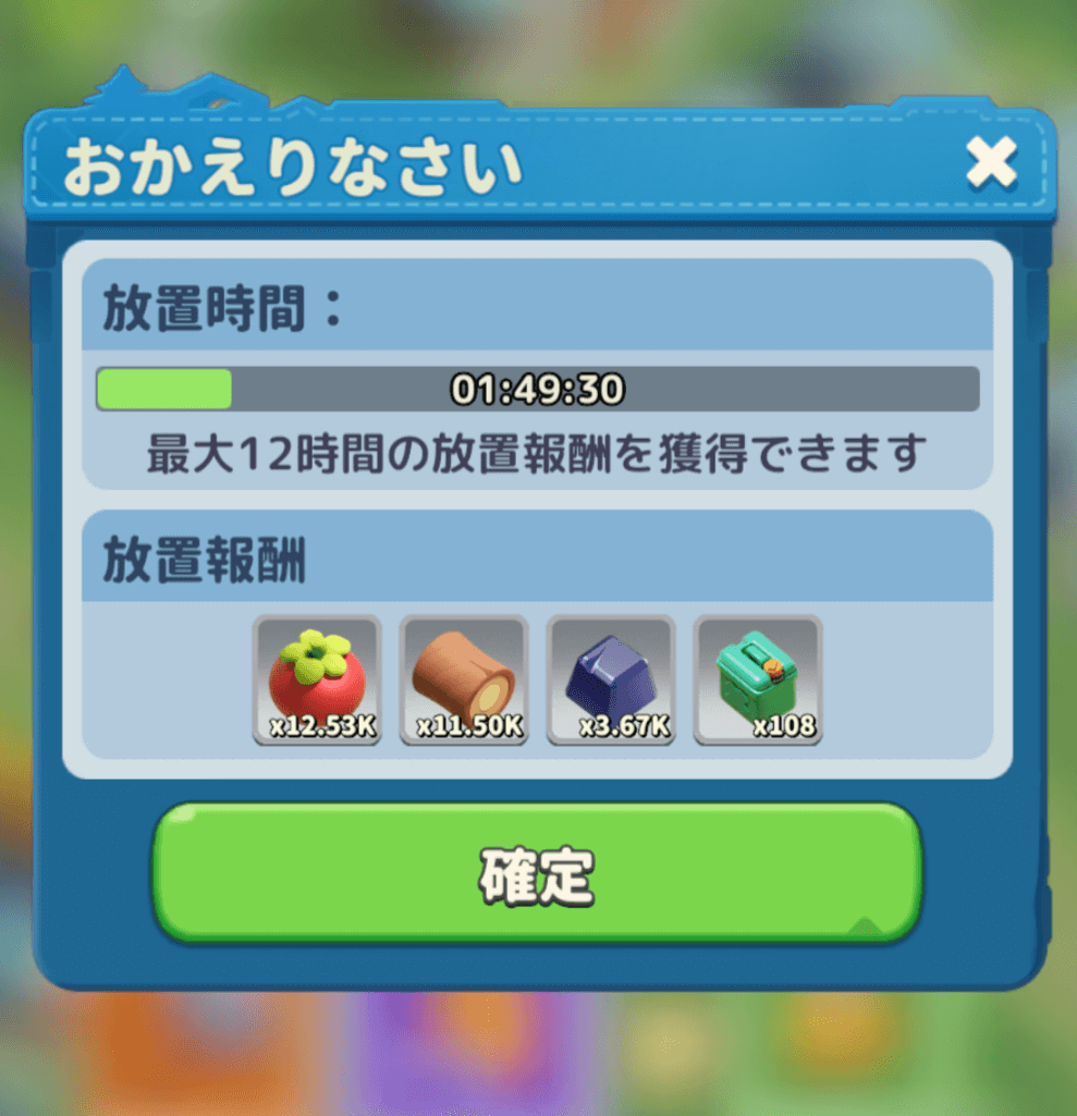 放置報酬で金属を入手できます。放置報酬は最大12時間分の報酬をためることができます。