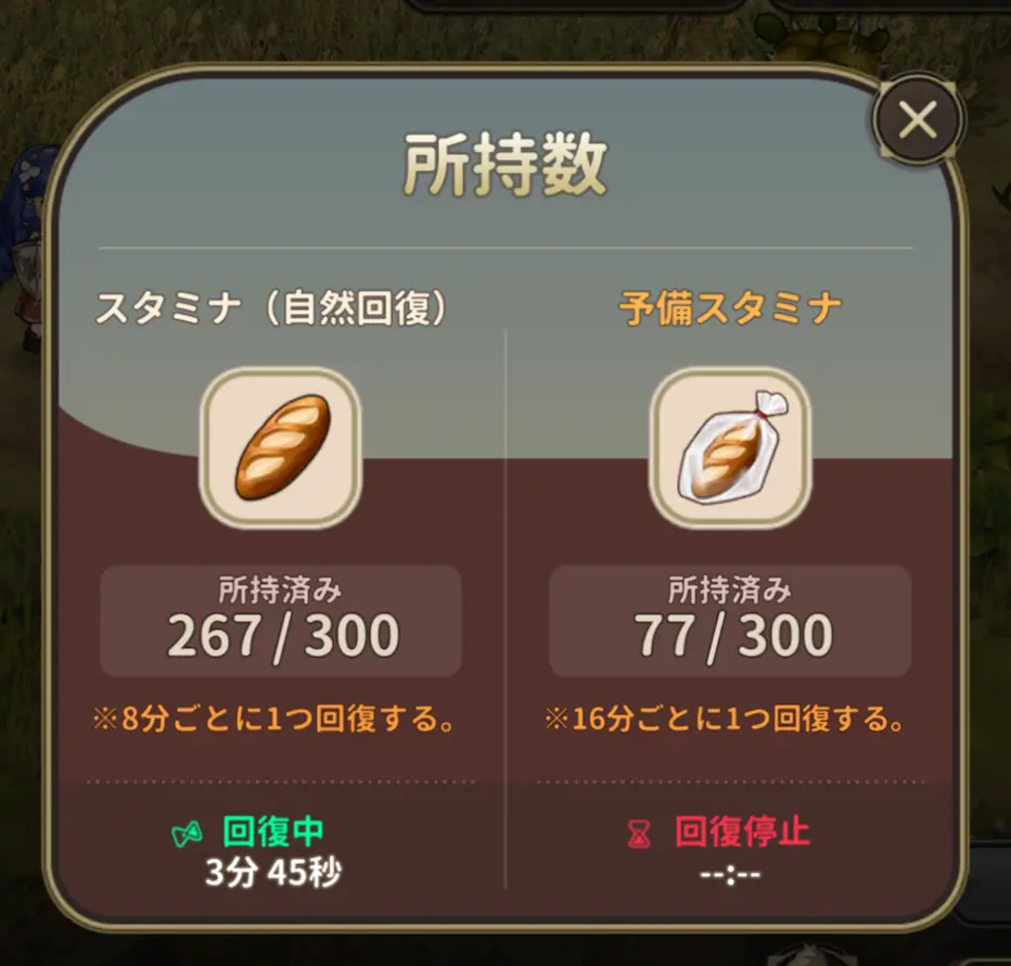 スタミナが300行くと立っていくのが予備スタミナです。予備スタミナあも最大300までためることができます。予備スタミナはスタミナが上限に来た場合のみ、16分に1回復します。