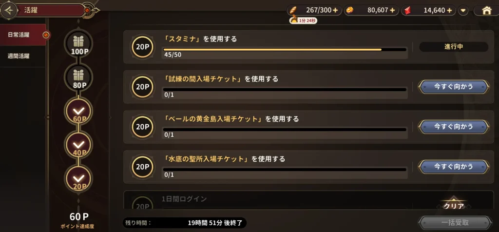 日常活躍でスタミナを入手できます。活躍ポイントが80までいくと、60入手できます。