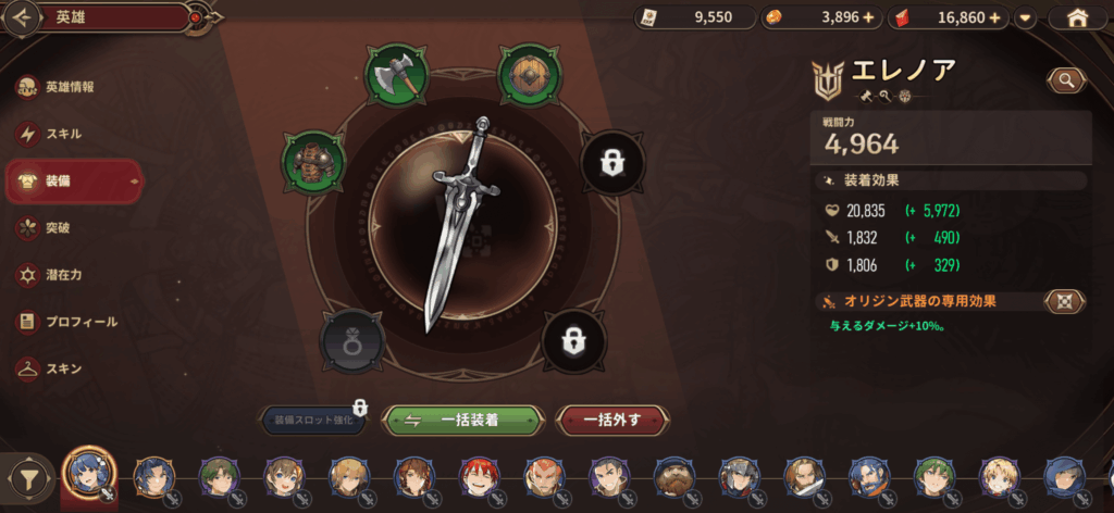 装備は英雄に装備します。メインで使用している英雄から装備していくことで効率的に戦闘力を上げることができます。