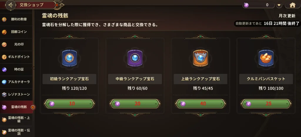 交換ショップで中級ランクアップ宝石を入手できます。光の印、ギルドポイント、霊魂の残骸のショップで交換することができます。ショップ交換は一定期間の交換上限があります。