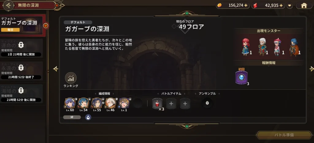 無限の深淵で中級ランクアップ宝石を入手できます。中級ランクアップ宝石を入手できるフロアは、ガガーブの深淵フロア49です。