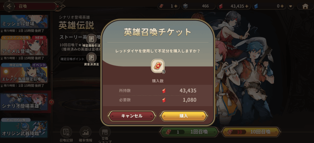 レッドダイヤの交換で英雄召喚チケットを入手できます。レッドダイヤは貴重なので交換する際は注意が必要です。