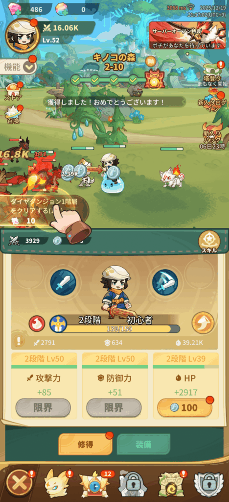 主人公の装備をすることで戦闘力が上がります。装備ごとにレベルやレア度が決まっており、高い方が強くなります。