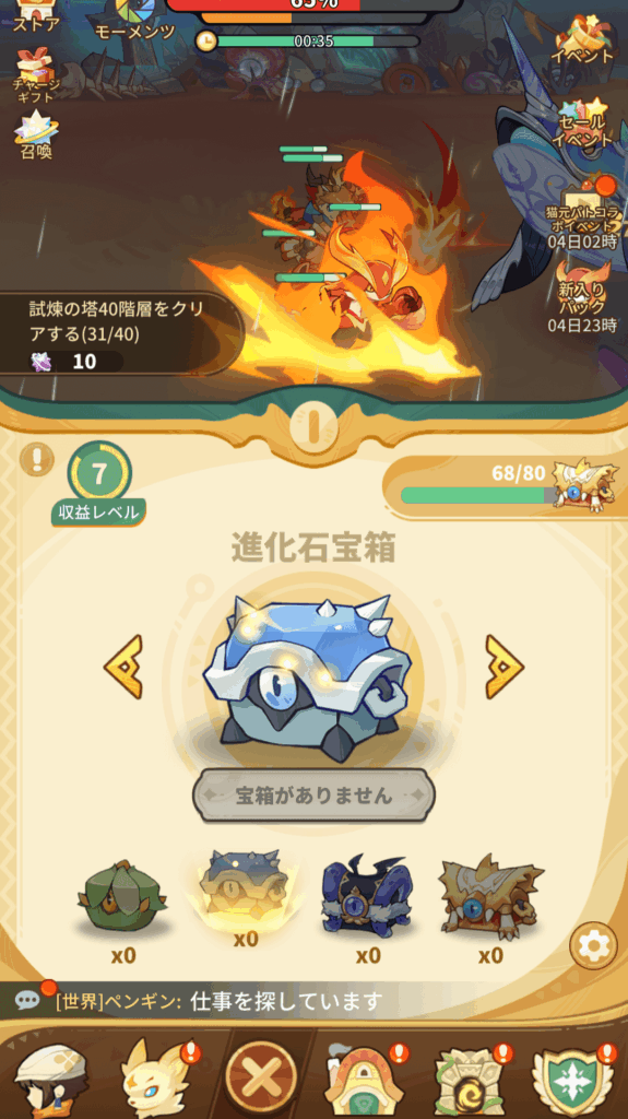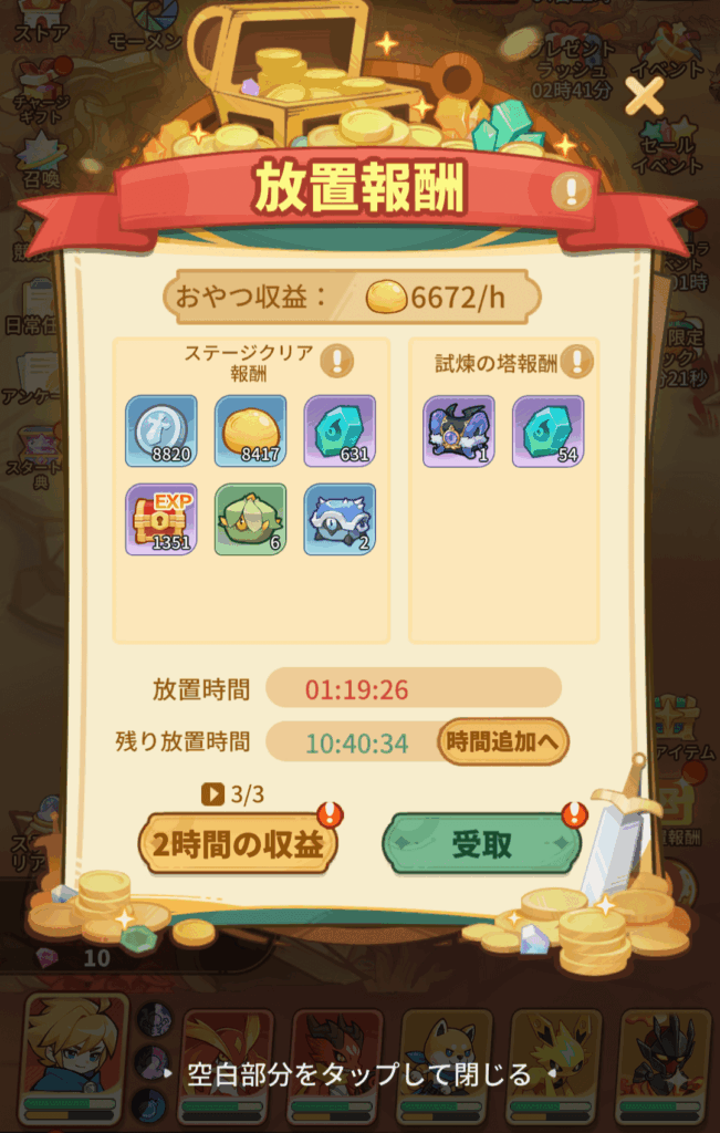 放置報酬で進化石を入手できます。放置報酬はメインステージ分と試練の塔の分の2つ分入手することができます。