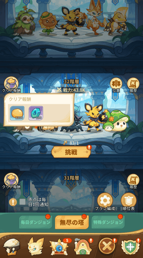 無尽の塔で進化石を入手できます。無尽の塔は階層が高くなるほど、難易度は上がりますが、報酬は良くなります。無尽の塔は戦力差があればスキップすることが可能になります。