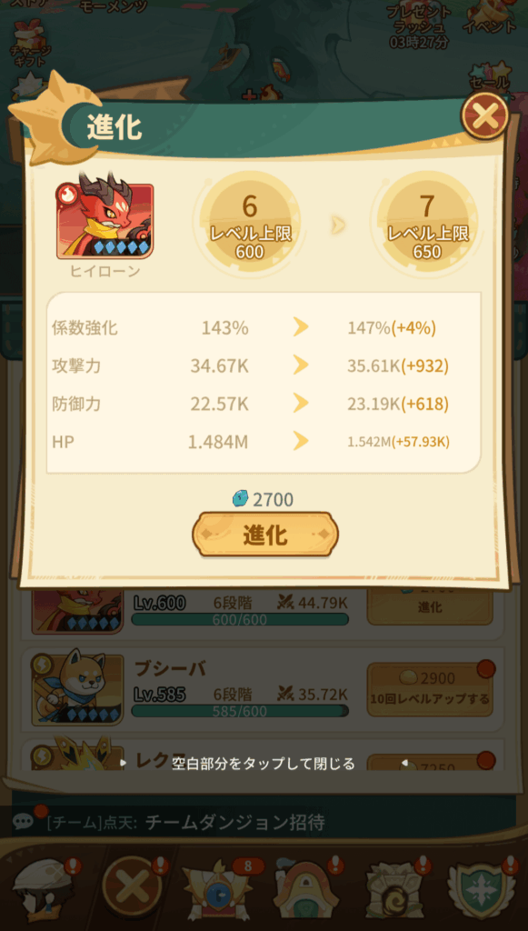 ポチの進化に進化石を使用します。ポチは一定レベルごとに進化させる必要があります。進化しなければ、レベル上限がきます。