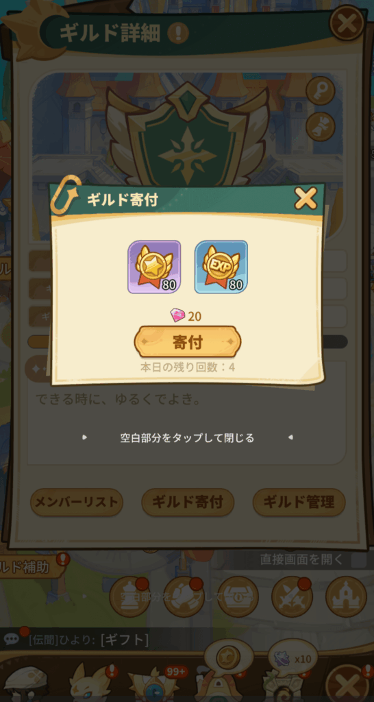 ギルド寄付を行うことでギルド貢献を入手できます。1日5回まで寄付を行うことができ、2回目以降はジェムを使用します。