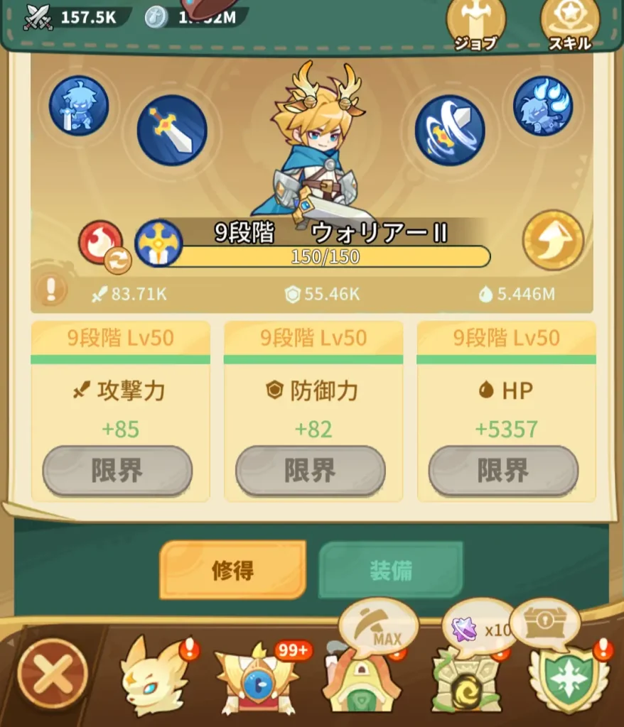 昇級を行うにはまず段階をレベル50にしておく必要があります。レベル50にすることで攻撃力、HP、防御力のステータスも上がるため、早く上げておきましょう。