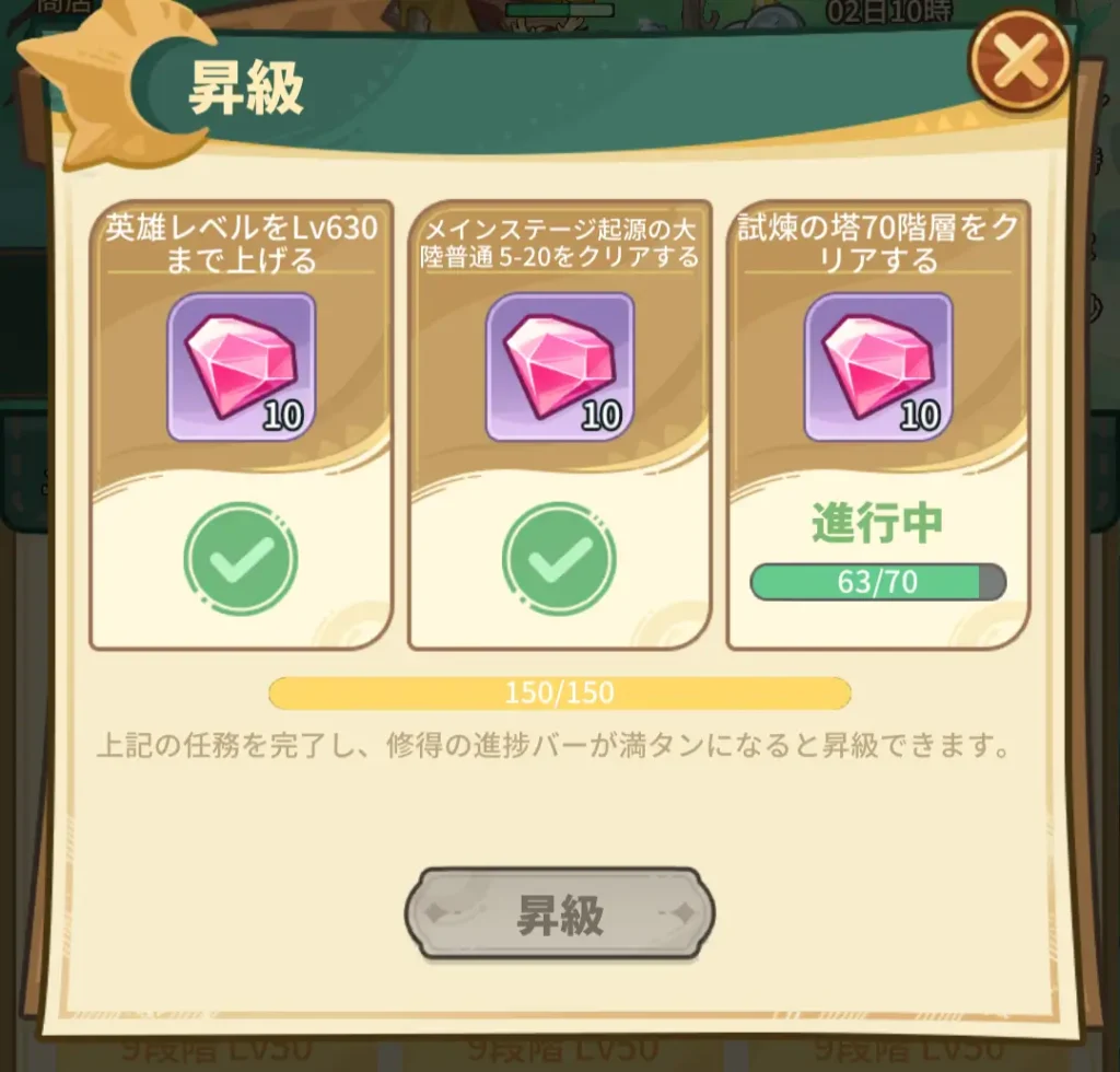 メインステージや試練の塔のクリアのようなミッションがあります。それらをクリアすることで昇級できるようになります。