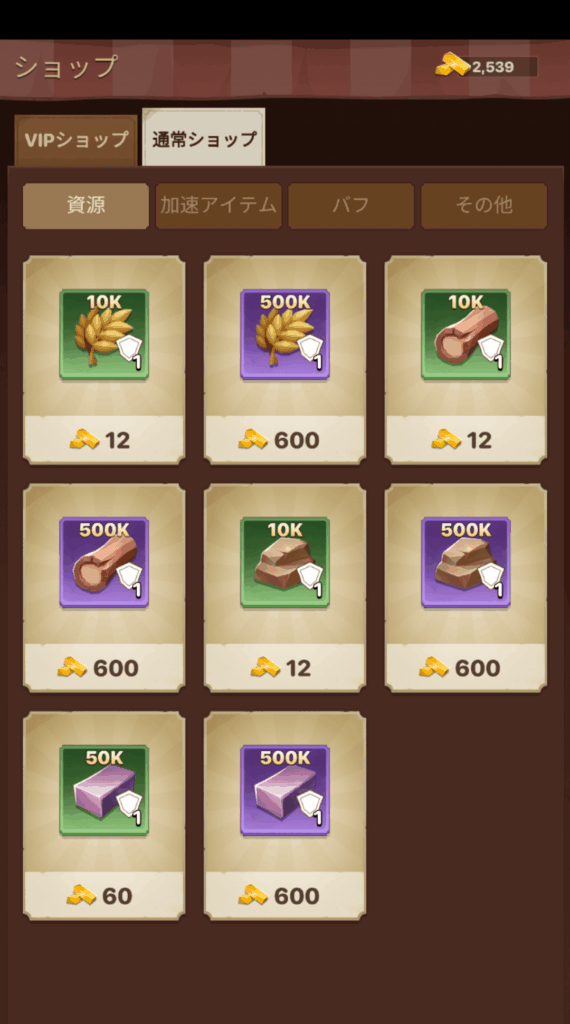 ショップでゴールドを使用してゲーム内アイテムを多く入手できます。資源や加速アイテムを入手できます。