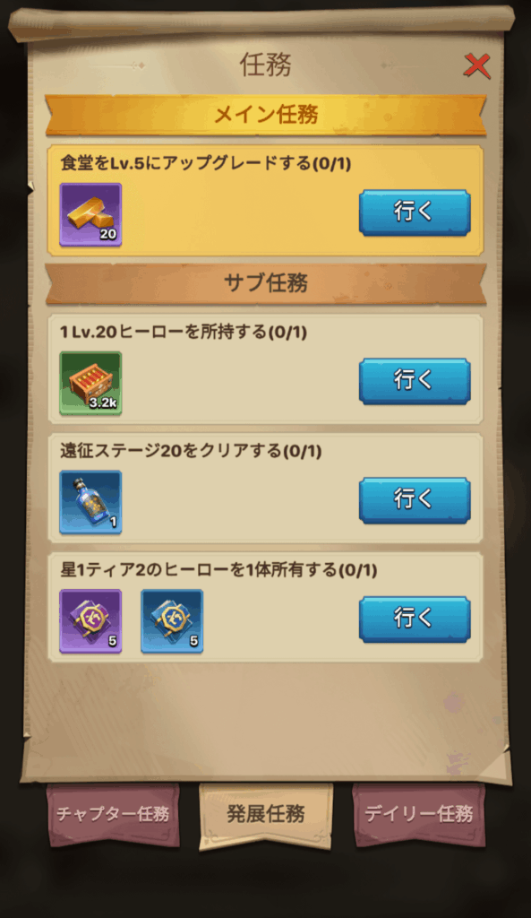 発展任務を行うと、ゴールドを入手できます。メイン任務での入手になります。サブ任務をクリアすると他のアイテムを入手できます。