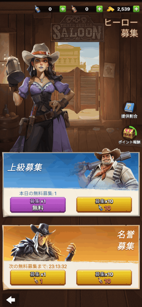 ヒーロー募集をすることでヒーローを入手できます。名誉募集は10回回すのに6000ゴールドを使用します。上級募集は500ゴールドで10回引くことができます。