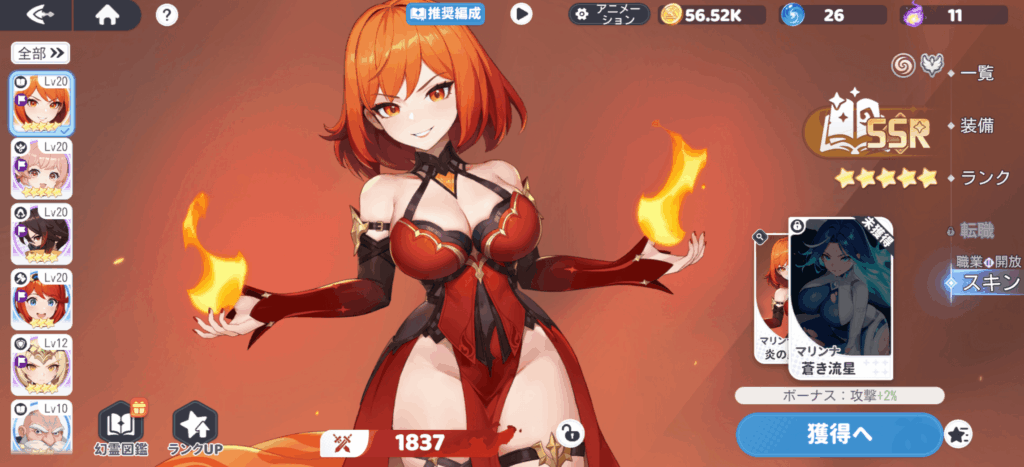 スキンを変更することでキャラを強化することができます。例えばマリンナだとスキンを変更すると攻撃力が2%上がります(画像)。