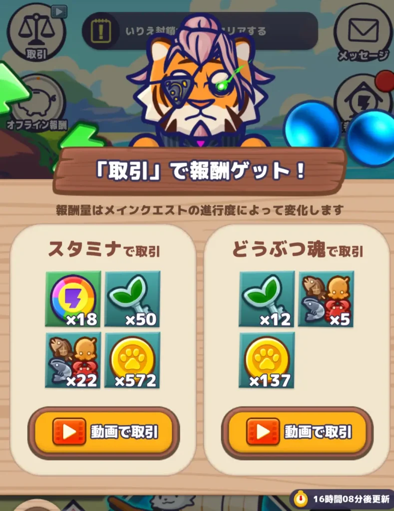 時間でスタミナを回復します。スタミナは5分毎に1回復します。スタミナは最大以上は回復しないので上限になる前に早めに消費しましょう。