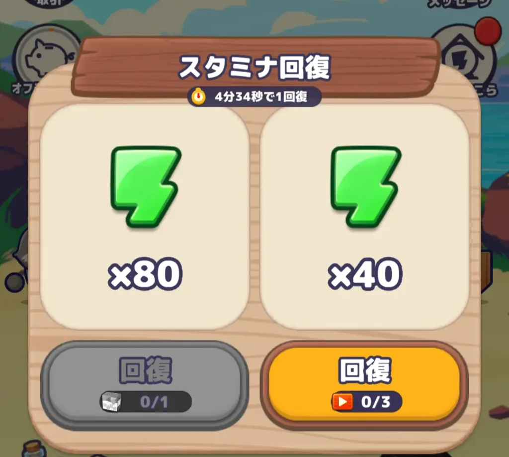 広告視聴でスタミナを回復することができます。広告視聴は1日3回までで、1回で40回復します。