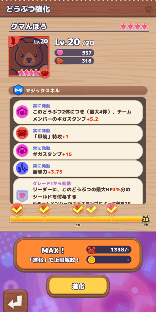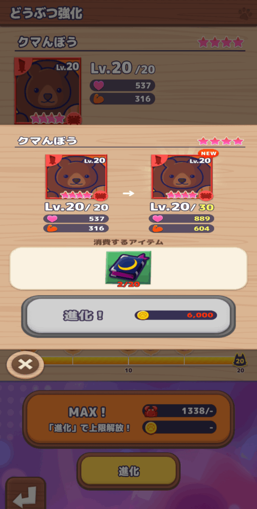 どうぶつをレベル上げすることで強化することができます。どうぶつは、強化アイテムとゴールドが必要になります。