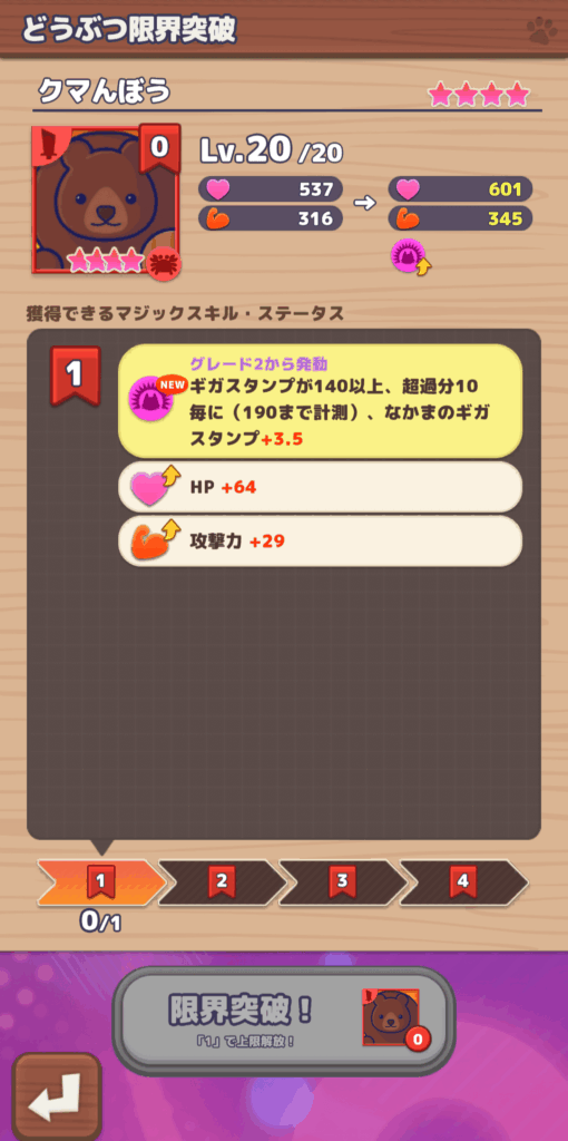 限界突破を行うことでどうぶつを強化できます。限界突破は凸要素で同じどうぶつが必要になります。