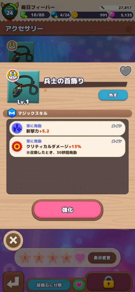 アクセサリーを装備することでどうぶつを強化することができます。アクセサリーはイベントや製造で入手できます。