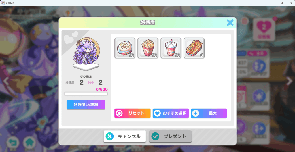好感度をあ上げることでキャラの強化をできます。好感度を上げるには食べ物をプレゼントすることでできます。