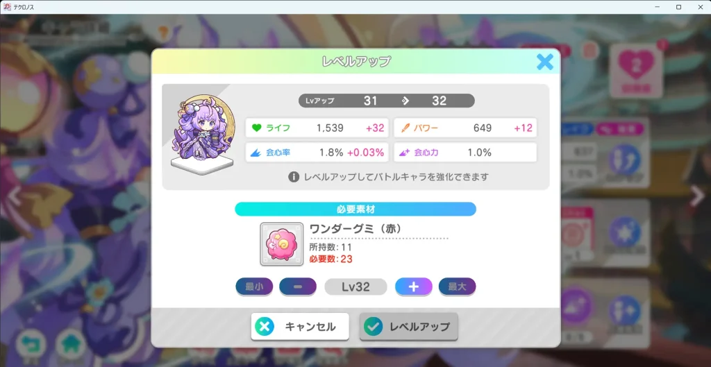 スキルを強化することでキャラを強化できます。スキルを上げるにはキャンディが必要になります。