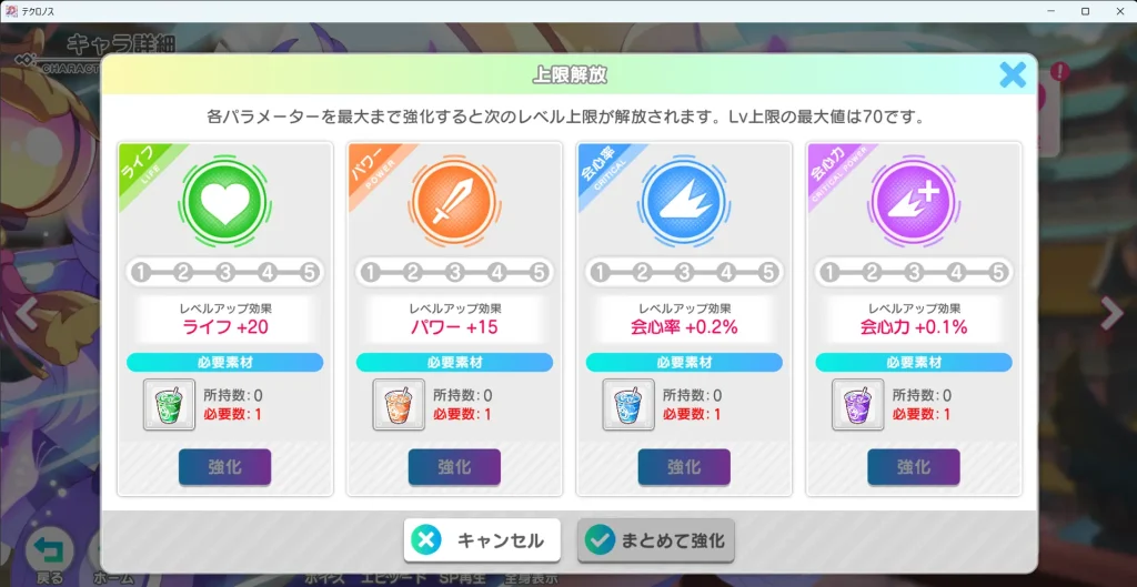 パラメータの上限を開放することでキャラを強化できます。パラメータの解放は特定のパラメータを強化することが可能になります。
