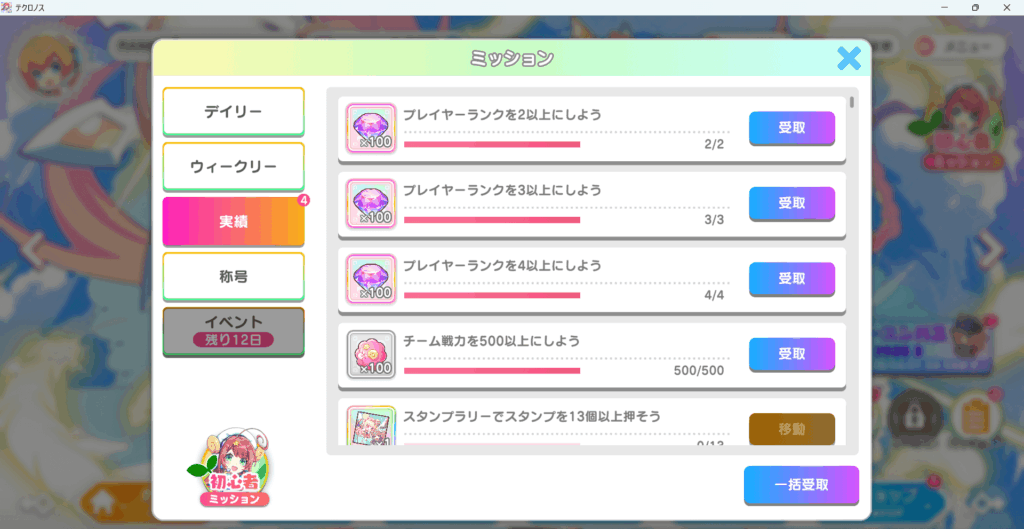 実績を完了することでミラクルストーンを入手できます。実績はゲームを進めていくと勝手に完了していくので受け取り忘れが無いようにしましょう。