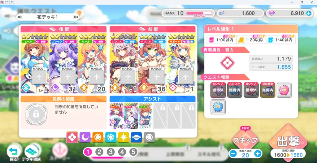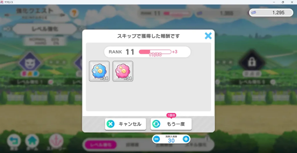 レベル強化クエストはスキップ機能が使用できます。入場券20個で1回分スキップが可能になります。スキップはクリアしたステージのみになります。