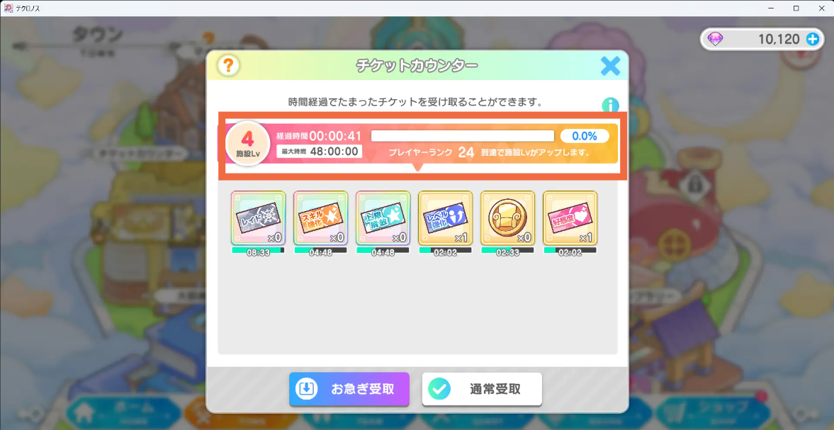 プレイヤーのランクを上げることでチケットカウンターのチケットがたまる時間が短くなります。一定のランクを上げることでチケットカウンターのレベルが上がります。