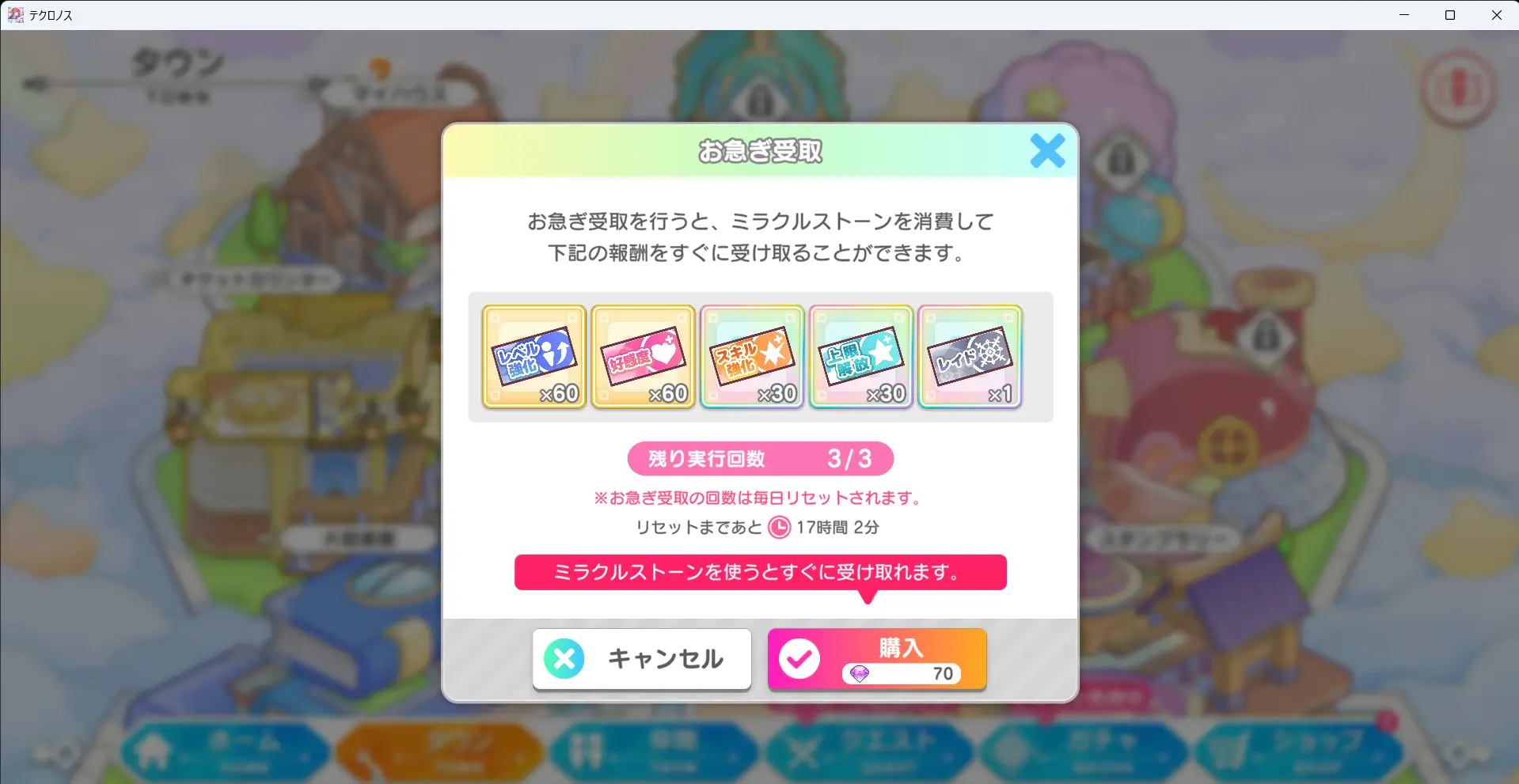 ミラクルストーンを使用することで高速でチケットがたまって入手できます。ミラクルは1日3回まで使用できます。