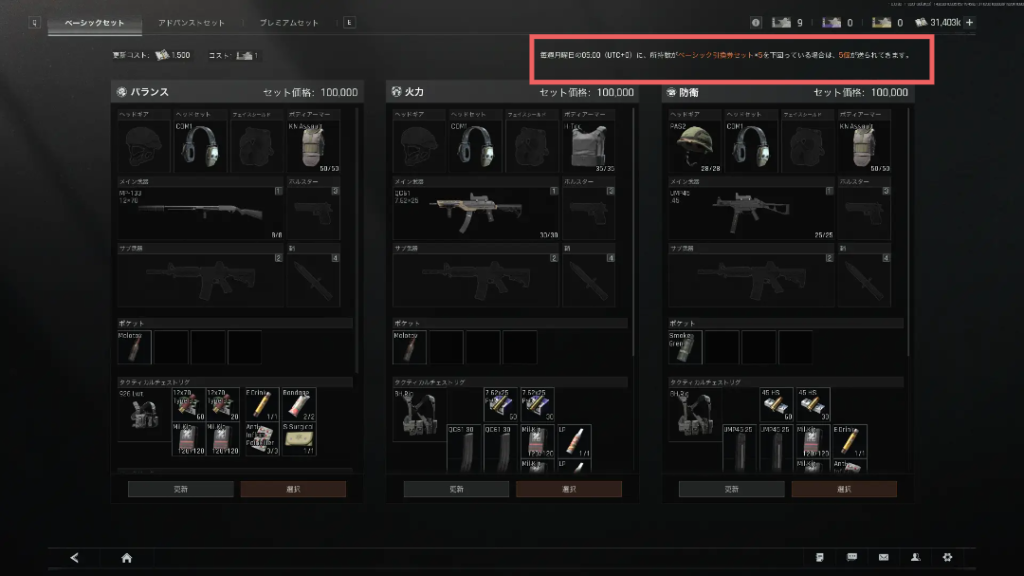 引換券は引換装備セットに使用できます。引換装備セットは、装備が最初からある程度そろっていて、持って帰れたら自分の巣日になるのでおすすめです。