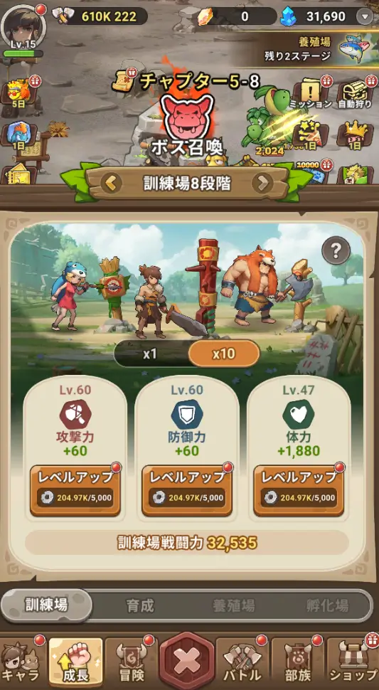 訓練場で戦力を上げることができます。訓練場で上げれるのは攻撃力、防御力、体力です。ストーンを使用して訓練場でレベルを上げます。